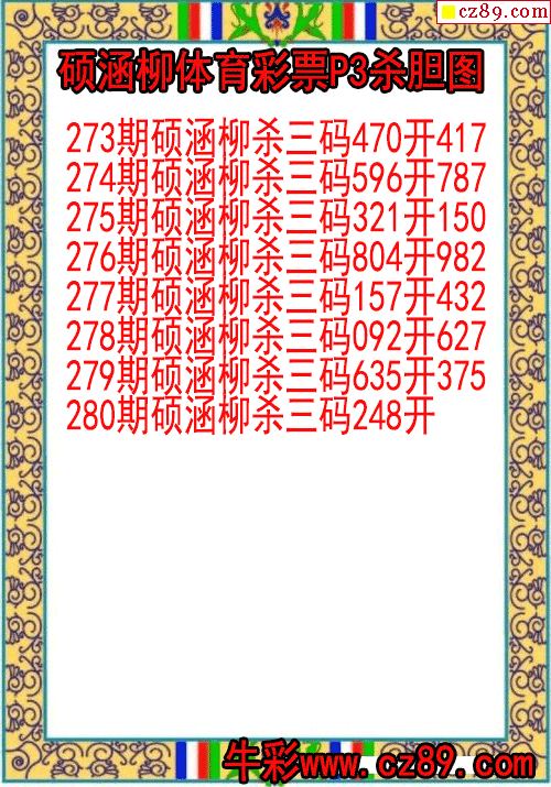 > 25年280期硕涵柳体育彩票P3杀胆图